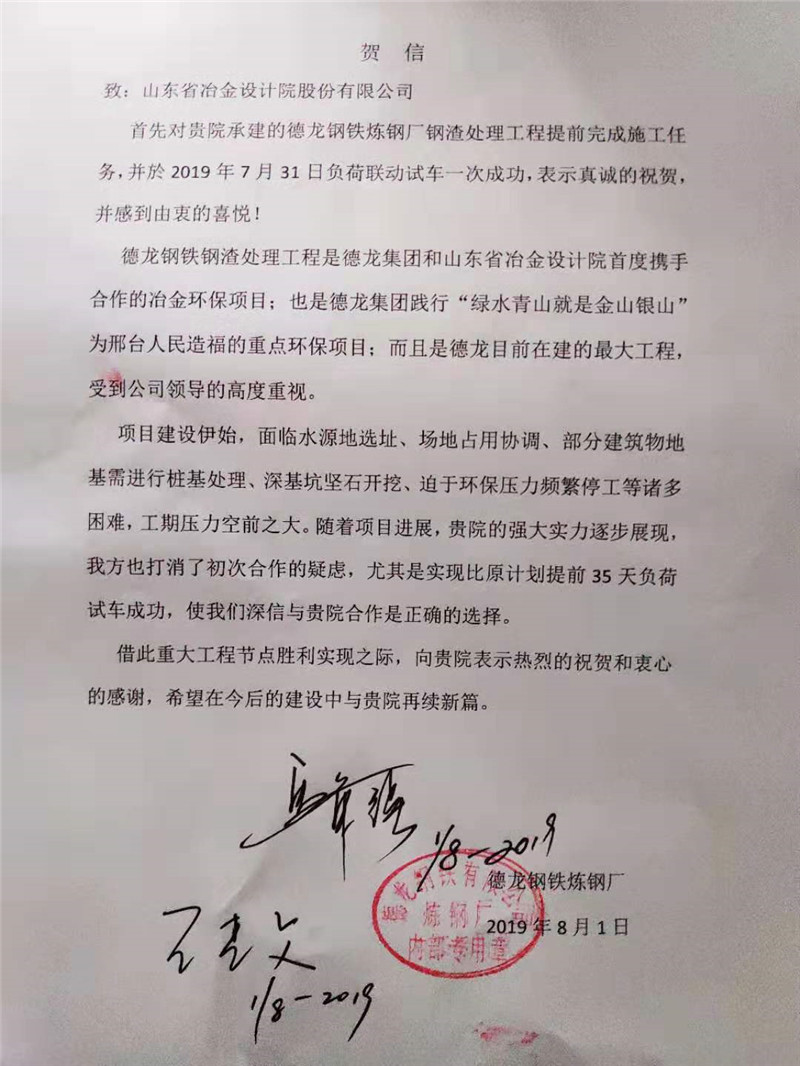 2019年7月31日14點(diǎn)58分,山冶設(shè)計(jì)總承包的德龍鋼鐵鋼渣處理項(xiàng)目負(fù)荷聯(lián)動(dòng)試車一次成功!比原計(jì)劃工期提前35天!第二日,收到業(yè)主的賀信: