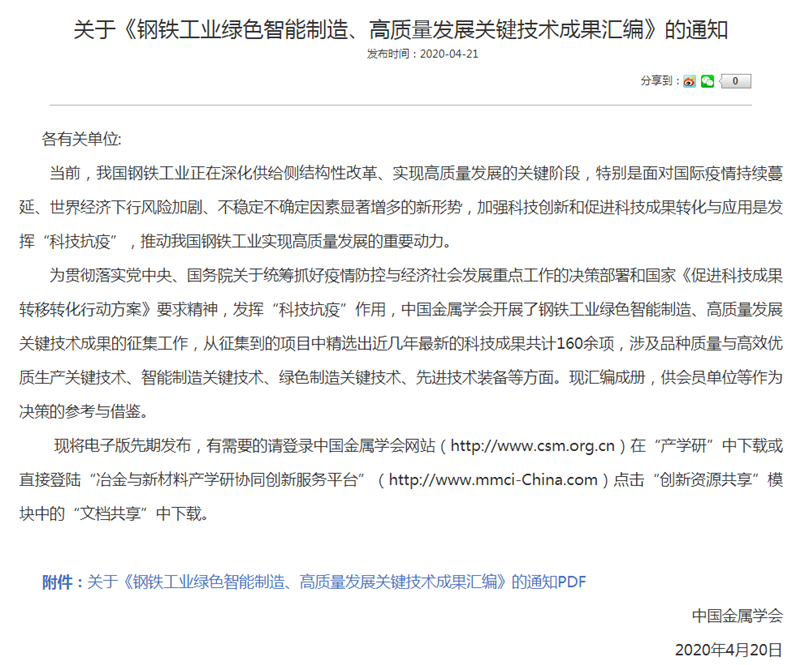 20191023日,中國金屬學會下發了《關于征集鋼鐵冶金行業關鍵共性技術的通知》(金字[2019]147號),開展2019-2020年度鋼鐵冶金行業關鍵共性技術的征集和發布工作。根據公司領導的部署,科技部訊速組織協調各專業部門準備申報材料,最終申報了焦化、煉鐵、軋鋼等專業的5項技術。