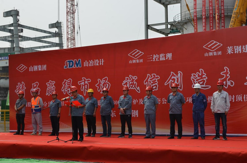 2020年6月28日9點(diǎn)50分,公司總包的山鋼股份萊蕪分公司新舊動(dòng)能轉(zhuǎn)換項(xiàng)目1號(hào)3800m3高爐熱風(fēng)爐順利封頂!山鋼股份萊蕪分公司新舊動(dòng)能轉(zhuǎn)換項(xiàng)目工程指揮部副指揮孫建設(shè),山鋼股份萊蕪分公司煉鐵廠經(jīng)理、高爐工程項(xiàng)目經(jīng)理部經(jīng)理張明,新舊動(dòng)能轉(zhuǎn)換項(xiàng)目工程指揮部高爐工程項(xiàng)目經(jīng)理部常務(wù)副經(jīng)理賈友劍,萊蕪三控冶金建設(shè)監(jiān)理事務(wù)所經(jīng)理沈桂聯(lián),我公司黨委書記、副總經(jīng)理谷卓奇,萊蕪鋼鐵集團(tuán)建筑安裝工程有限公司黨委書記、董事長時(shí)元海,萊蕪鋼鐵集團(tuán)建筑安裝工程有限公司副經(jīng)理梁博,上海二十冶萊鋼高爐項(xiàng)目部項(xiàng)目經(jīng)理李虎,中國十九冶萊鋼高爐公輔項(xiàng)目部項(xiàng)目副經(jīng)理田澤龍,河北省安萊鋼高爐噴煤及鑄鐵機(jī)項(xiàng)目部項(xiàng)目經(jīng)理王紅帥,中十冶萊鋼主控樓項(xiàng)目部項(xiàng)目經(jīng)理馬少華出席了儀式。