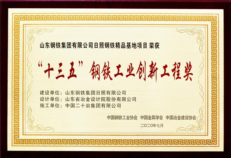 2020731,中國鋼鐵工業十三五科技創新成果展暨頒獎典禮在江蘇張家港舉行,由山冶設計總體規劃設計的山東鋼鐵集團有限公司日照鋼鐵精品基地項目,榮獲十三五鋼鐵工業創新工程獎。公司董事長魏新民參加了頒獎大會并上臺領獎。