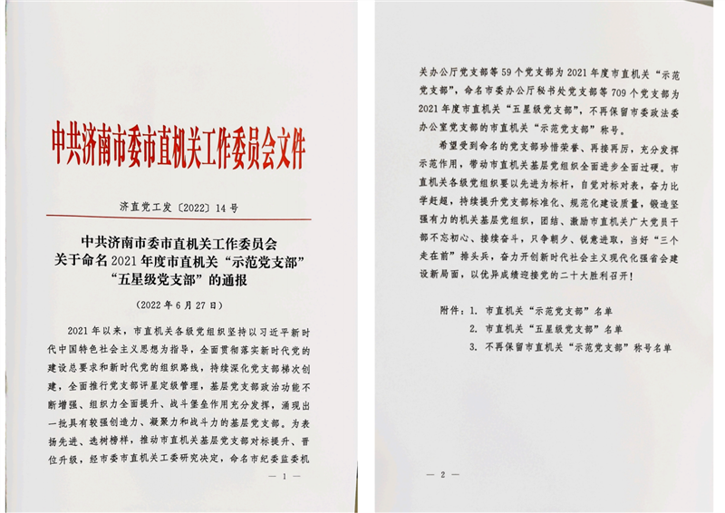 市委市直機(jī)關(guān)工委印發(fā)的《關(guān)于命名2021年度市直機(jī)關(guān)“示范黨支部”、“五星級(jí)黨支部”的通報(bào)》(濟(jì)直黨工發(fā)〔2022〕1號(hào)文)中,授予我單位熱風(fēng)爐工程技術(shù)分公司黨支部、焦化事業(yè)部黨支部、耀華能源公司黨支部、土建設(shè)計(jì)一部黨支部、土建設(shè)計(jì)二部黨支部、職能管理第一黨支部、公司辦公室黨支部、電氣設(shè)計(jì)部黨支部、經(jīng)營(yíng)管理黨支部、職能管理第二黨支部共10個(gè)黨支部為“五星級(jí)黨支部”。獲獎(jiǎng)支部將繼續(xù)發(fā)揮示范作用,團(tuán)結(jié)激勵(lì)支部黨員,不忘初心、勇于擔(dān)當(dāng),努力為公司發(fā)展做出更大貢獻(xiàn)。