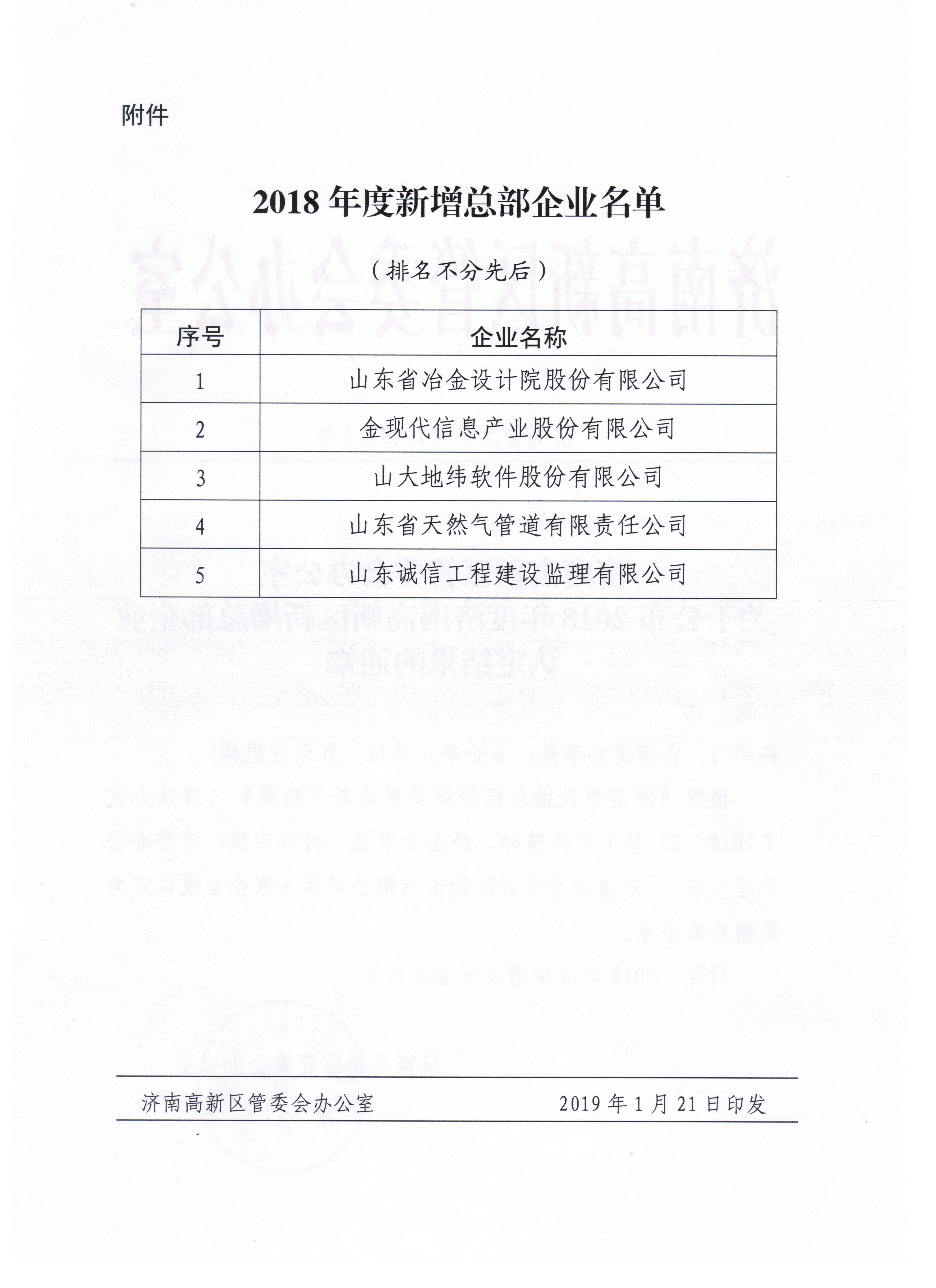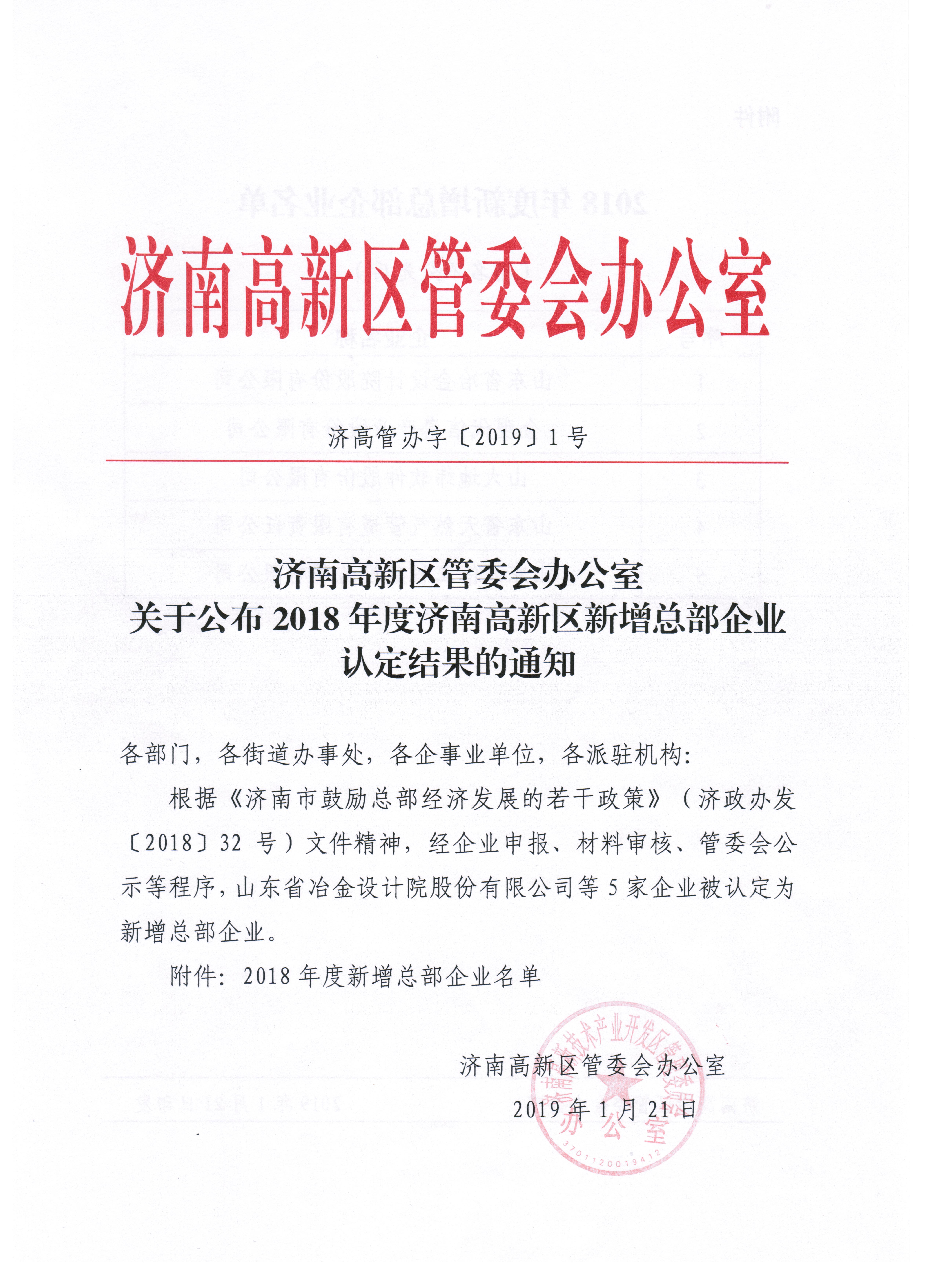 近日,山東省冶金設(shè)計院股份有限公司被濟南市認定為首批“總部企業(yè)”。這標(biāo)志著我公司的綜合實力以及對地方發(fā)展的貢獻得到了濟南市政府的高度認可。