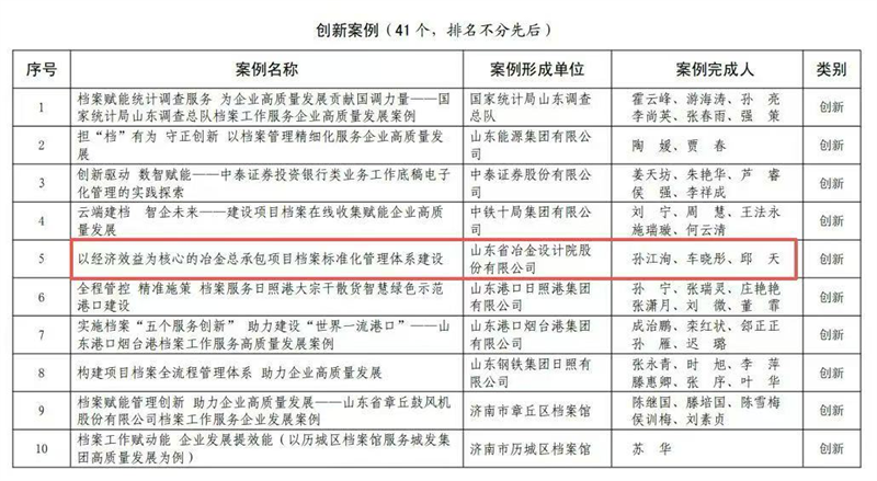 9月9日,山東省檔案館發布《關于公布全省檔案業務工作創新案例評選結果的通知》。其中,山冶設計申報的《以經濟效益為核心的冶金總承包項目檔案標準化管理體系建設》入選“檔案服務企業高質量發展案例”創新案例。此案例深入總結了山冶設計在開展總承包工程近二十年間,幾代山冶檔案人關于總承包檔案管理的經驗,并結合公司發展需求,初步構建起“以經濟效益為核心的冶金總承包項目檔案標準化管理體系”。